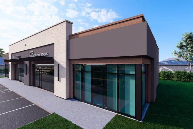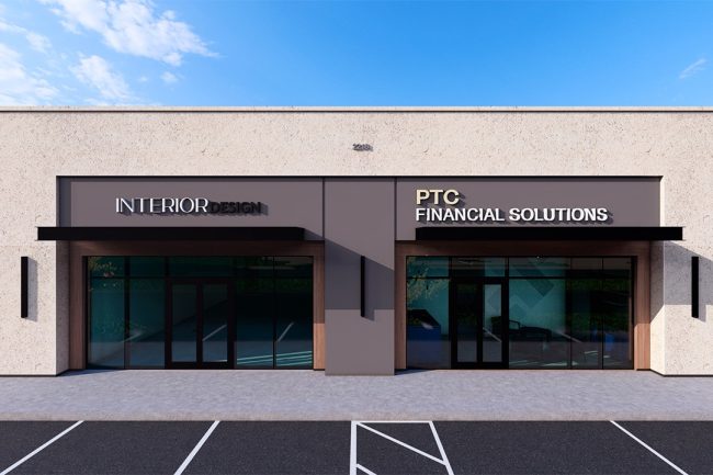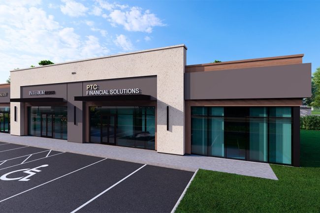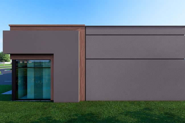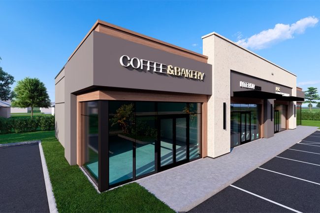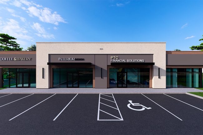 This project, located in Cape Coral, Florida, is a modern business center developed at a schematic and conceptual level, including modeling and rendering as part of the initial design presentation. It is designed to accommodate four commercial units and features a contemporary façade that combines natural stone finishes with wood-toned accents and dark colors, creating a balanced contrast that gives the building an elegant and professional appearance.